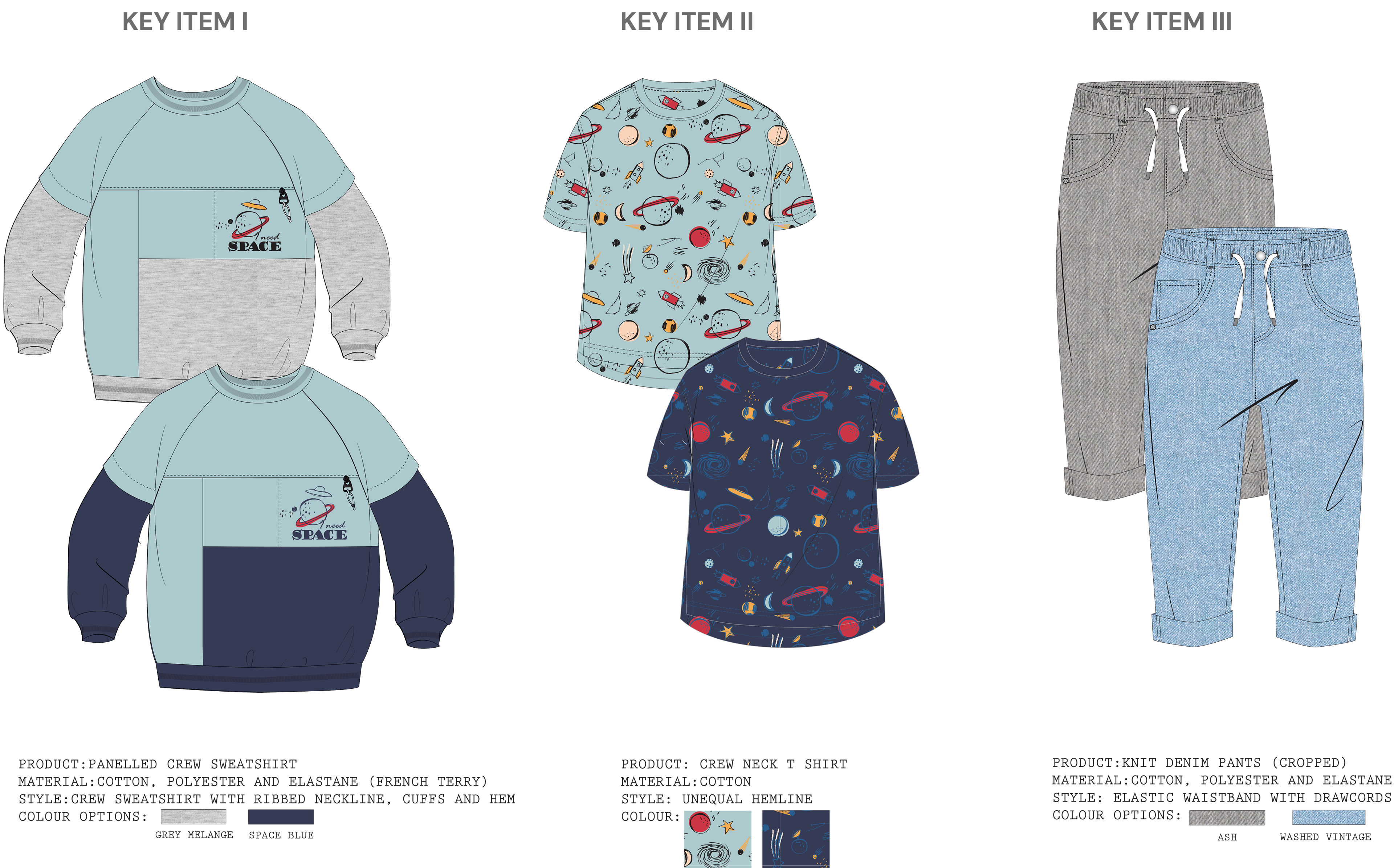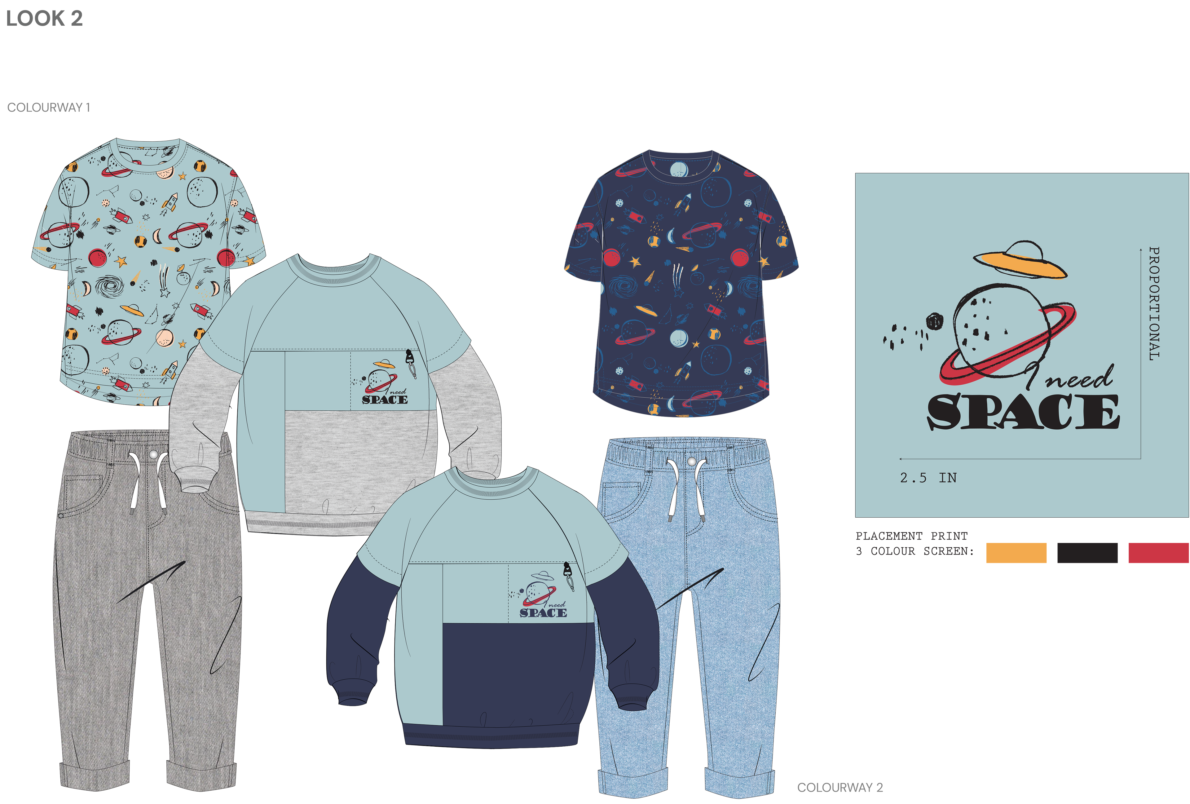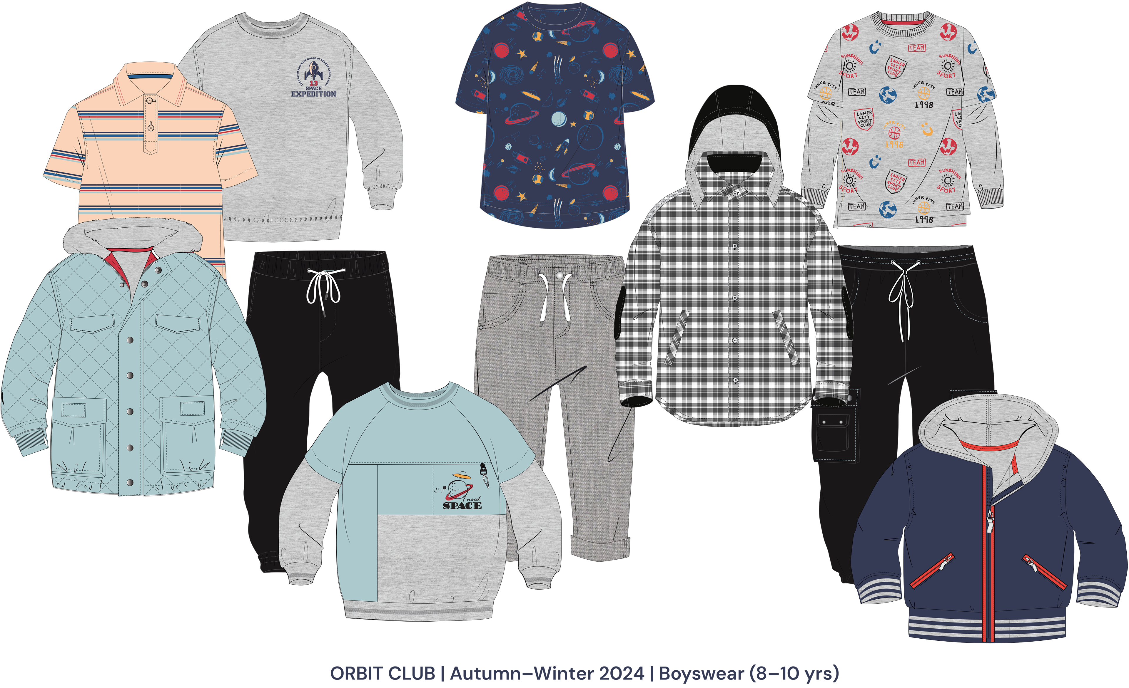 Orbit Club is an AW25 boyswear collection for ages 8–10 inspired by space exploration and playful science, combining relaxed, baggy silhouettes with bold graphics and all-over prints that spark imagination and movement. A vibrant palette of honey yellow, space and vintage blues, sky dust, chilli red, and black sets a strong seasonal base, while rockets, planets, astronauts, and retro typography bring energy to everyday dressing—celebrating curiosity, comfort, and creativity for young explorers.