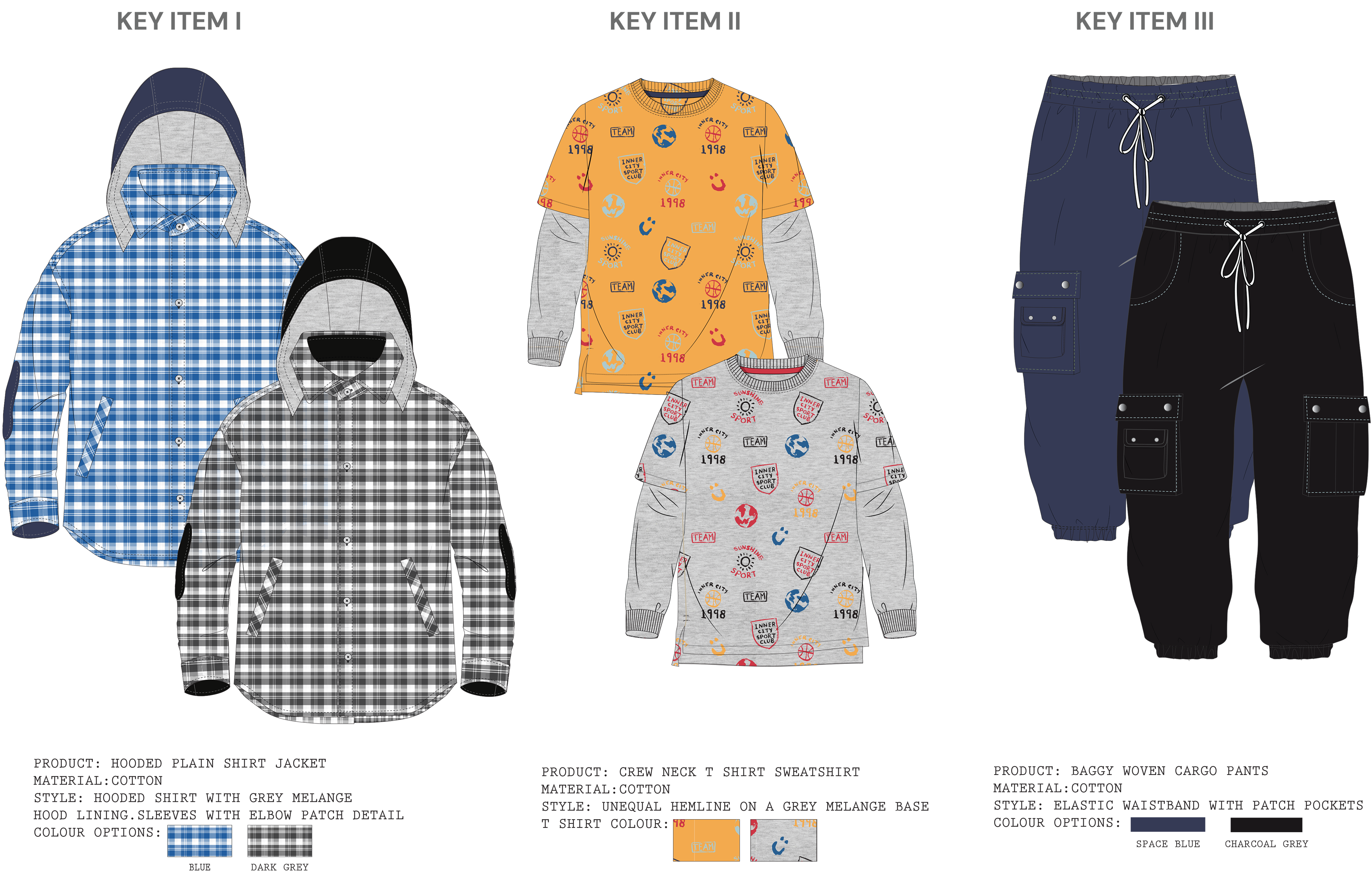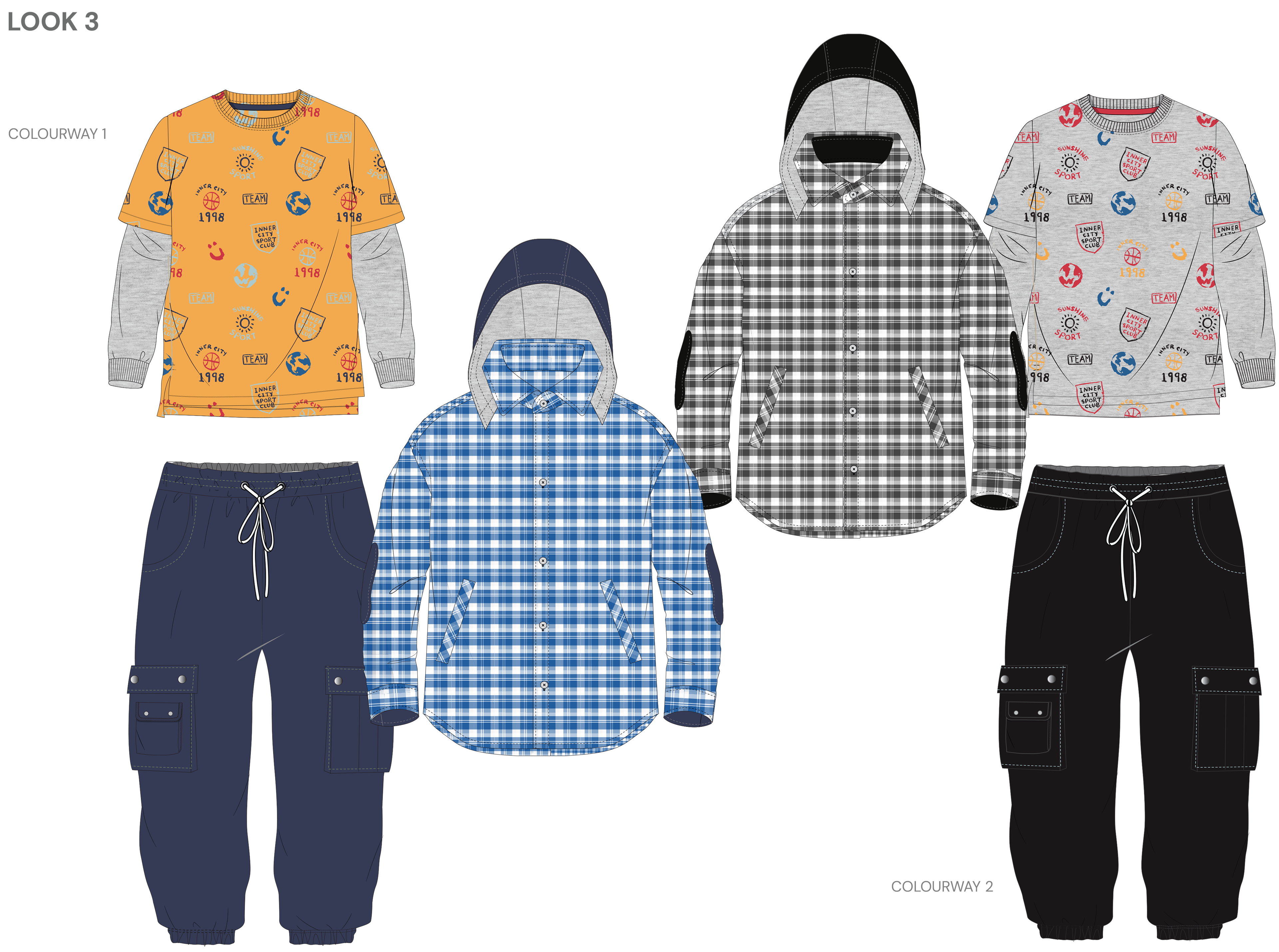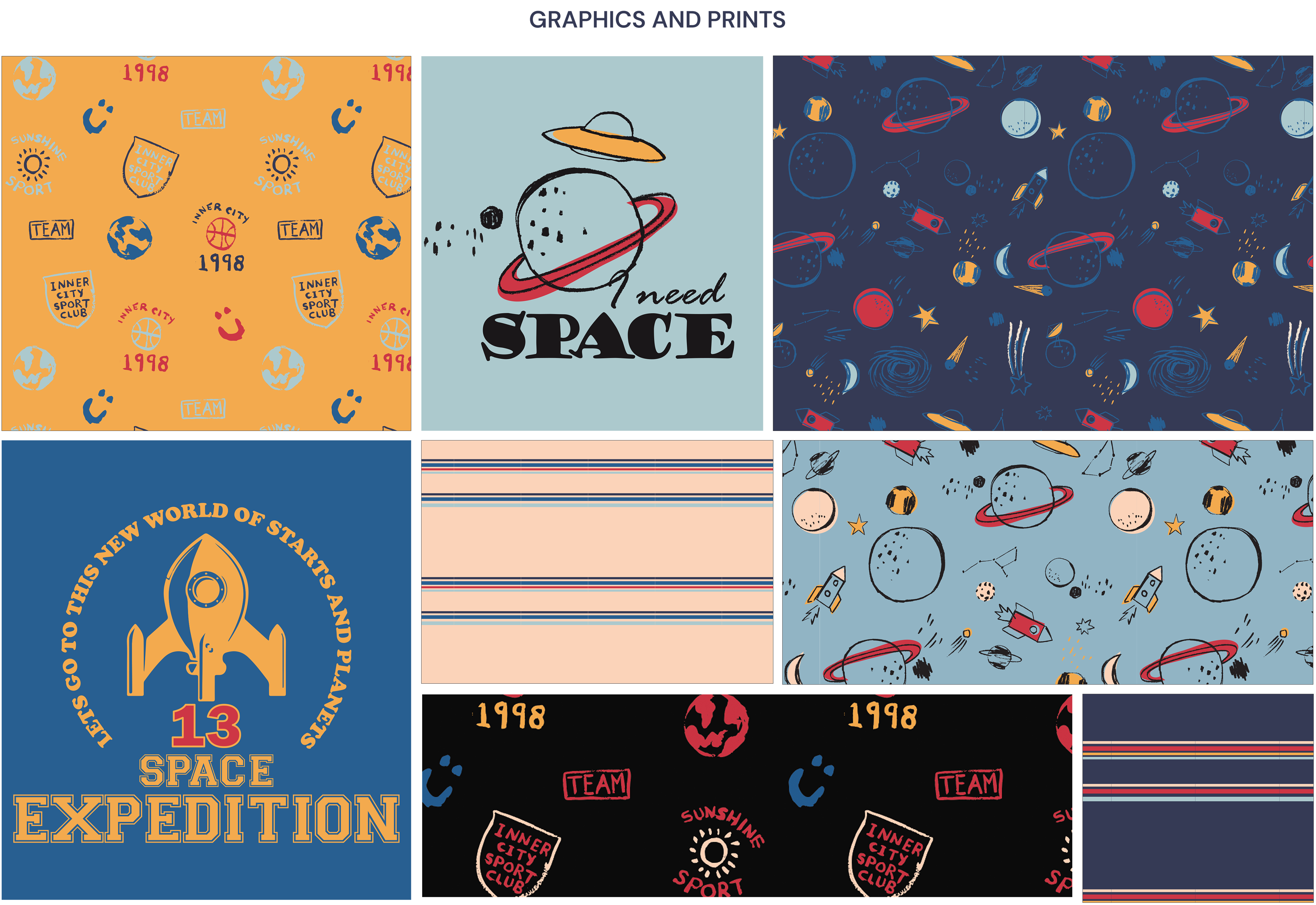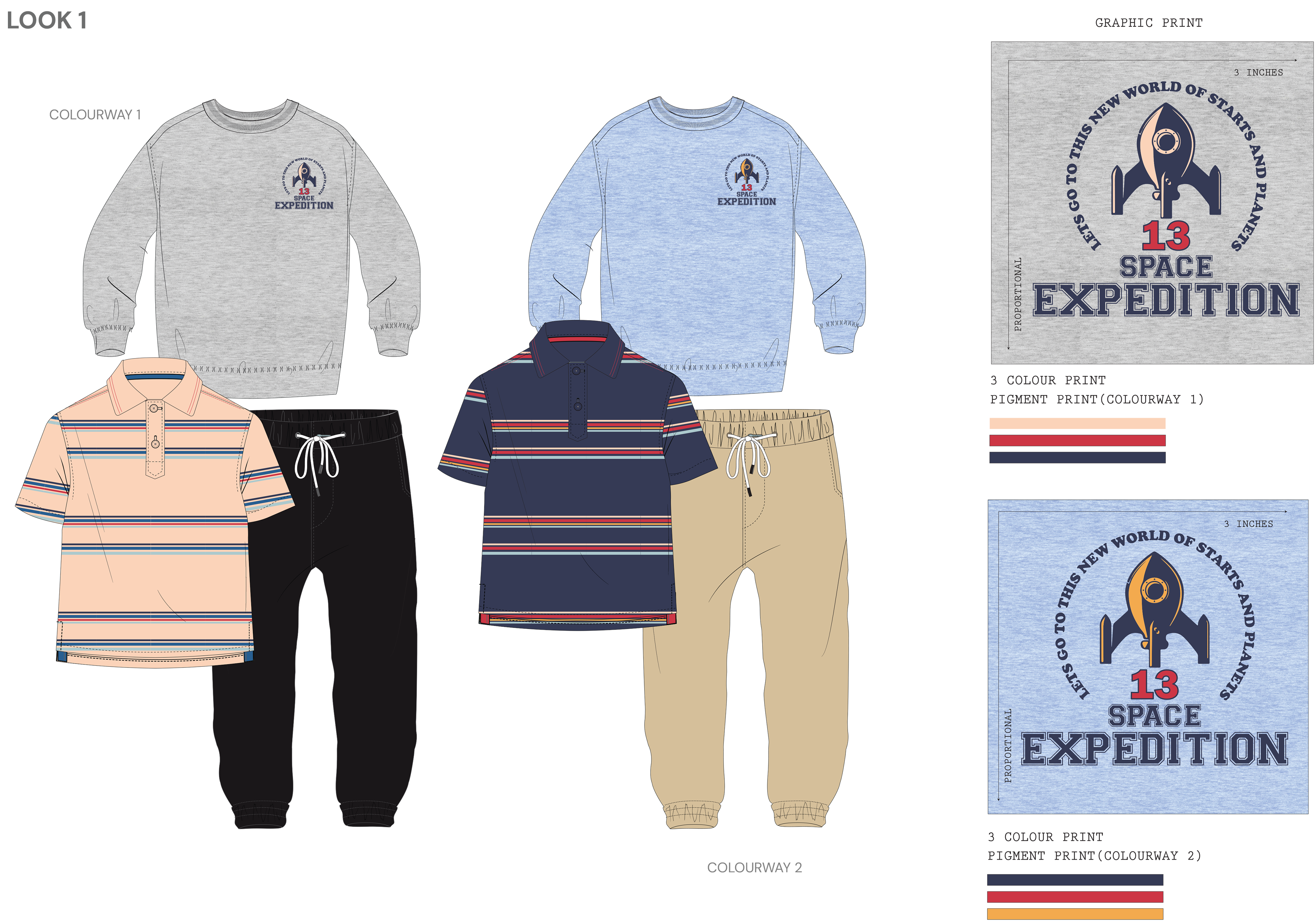 Orbit Club is an AW25 boyswear collection for ages 8–10 inspired by space exploration and playful science, combining relaxed, baggy silhouettes with bold graphics and all-over prints that spark imagination and movement. A vibrant palette of honey yellow, space and vintage blues, sky dust, chilli red, and black sets a strong seasonal base, while rockets, planets, astronauts, and retro typography bring energy to everyday dressing—celebrating curiosity, comfort, and creativity for young explorers.